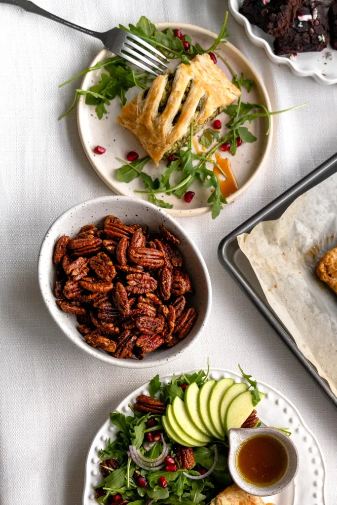 Cette année, on t'a préparé un menu de Noël complètement décadent. On a pensé à TOUT. Des canapés festifs sur patate douce, au feuilleté aux épinards et aux artichauts chaud, croustillant et réconfortant, accompagné d'une salade débordante de textures et de saveurs, aux brownies moelleux à la canne de Noël, tout y est pour que vos invités tombent de leur chaise. En prime, les gens ne se sentiront pas ballonnés et vous pourrez continuer à célébrer la magie des Fêtes, le bedon bien rempli.
